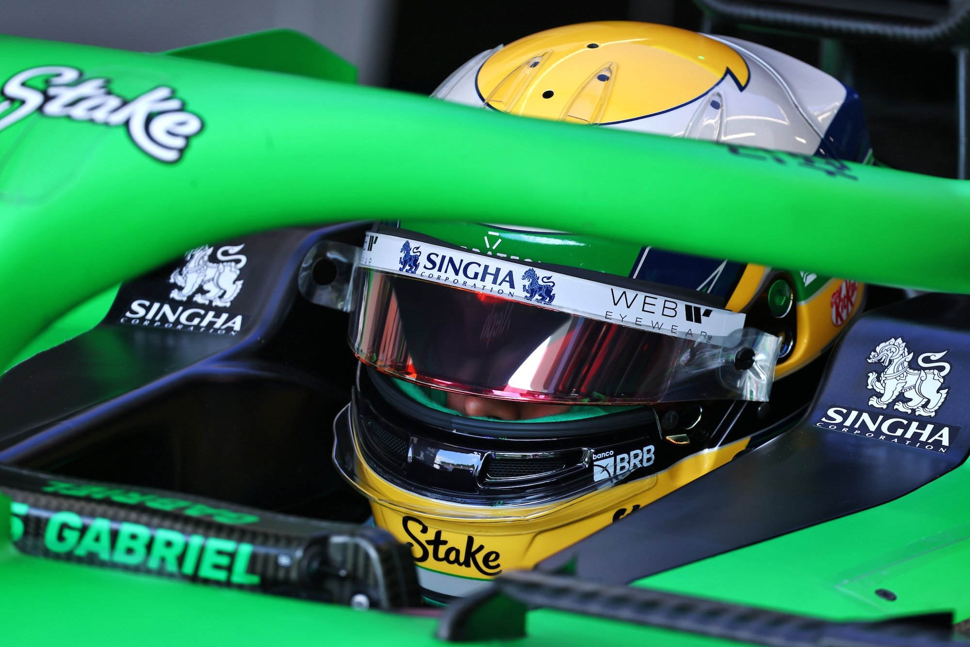 E em seu ano de estreia, optou por um casco bastante brasileiro: leva as cores verde e amarela, da bandeira do Brasil, e em cima é branco e também tem um detalhe em amarelo. Então, no Beyond the Grid, ao ser questionado sobre o design, Gabriel explicou as inspirações.