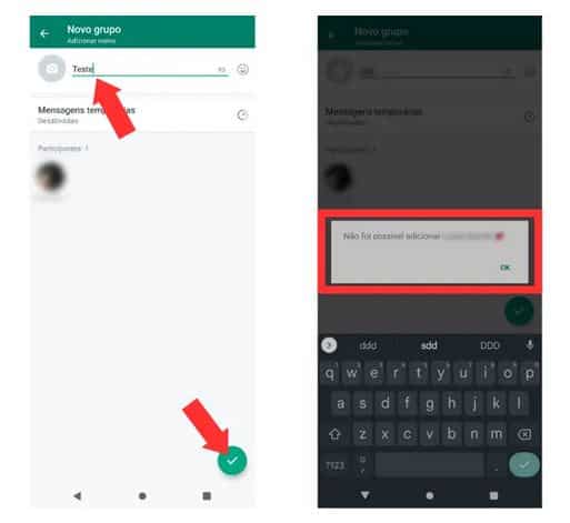 PASSO 3: Digite um nome aleatório para o grupo e clique na seta da parte inferior da tela para confirmar o procedimento. Se você estiver bloqueado, o WhatsApp exibirá uma caixa de mensagem informando que não foi possível adicionar a pessoa ao grupo.