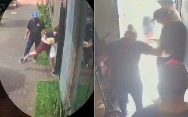 Imagens do lado de fora mostram quando advogado joga feijão na gerente de padaria em Ribeirão Preto, SP; do outro lado, a reação da funcionária ao ser atingida pela vasilha com comida — Foto: Câmeras de segurança/Reprodução