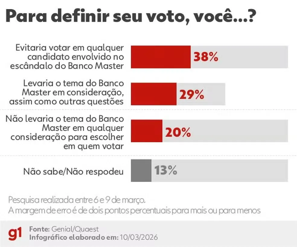 - 20% dizem que não levariam o tema do Banco Master em consideração para escolher em quem votar;