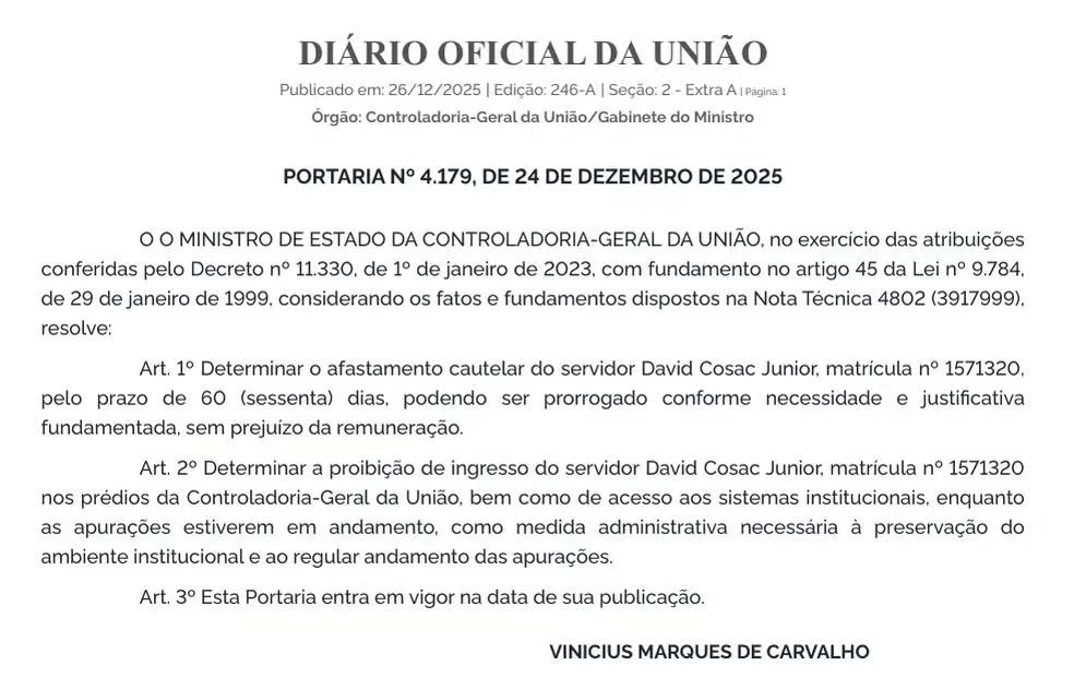 Em sessão extra do Diário Oficial da União desta sexta-feira (26), foi publicado o afastamento cautelar do servidor por 60 dias (veja foto abaixo).